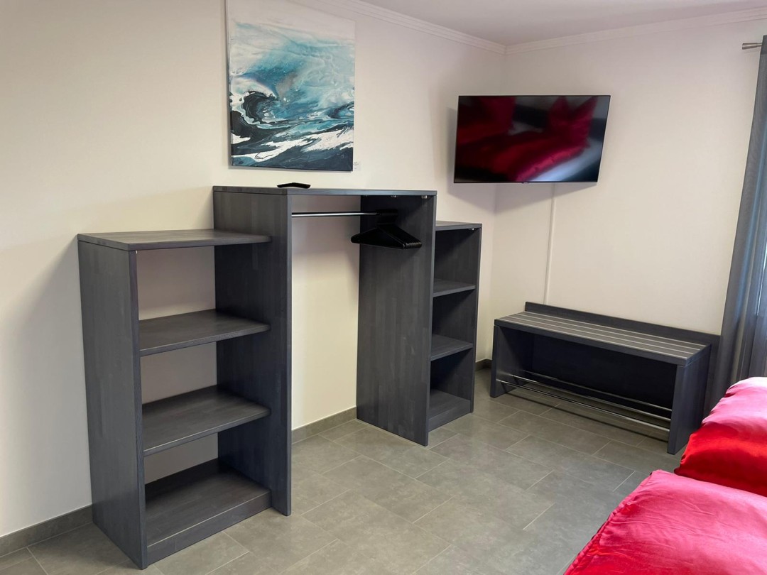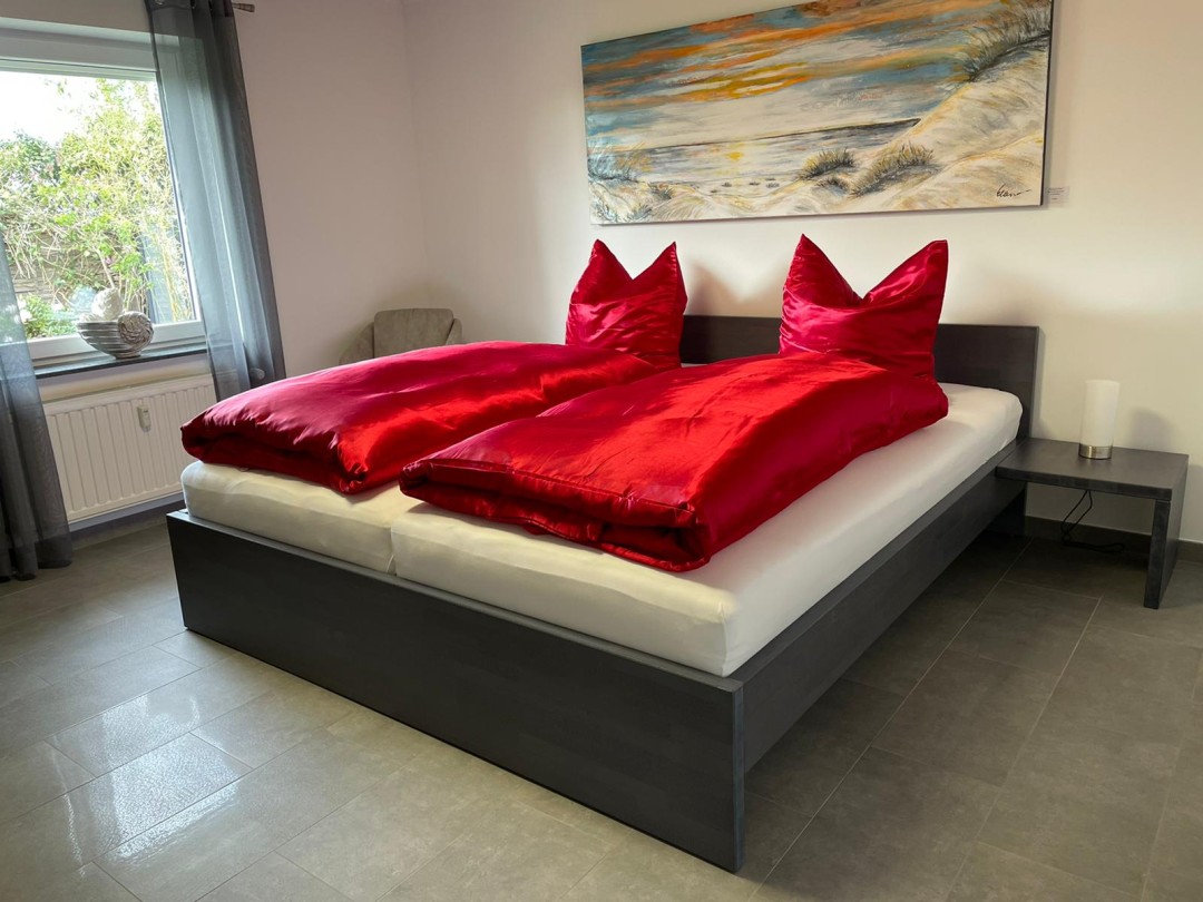 - Das 1 . Schlafzimmer im EG ist mit einem grossem Doppelbett (2 x 2,20m und offenem Fußende) und Fernseher eingerichtet.